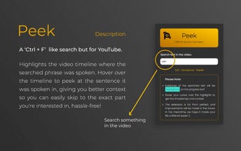 Peek เป็นส่วนเสริมของ Chrome ที่ช่วยให้ผู้ใช้สามารถค้นหาวิดีโอบน YouTube ได้ในลักษณะที่คล้ายกับการใช้ฟังก์ชัน "Ctrl + F" ในเอกสาร PDF โดยมันจะเน้นไทม์ไลน์ของวิดีโอที่พูดถึงวลีที่ค้นหา ซึ่งจะให้บริบทที่ดีกว่าและช่วยให้ผู้ใช้สามารถข้ามไปยังส่วนที่ต้องการได้อย่างง่ายดาย